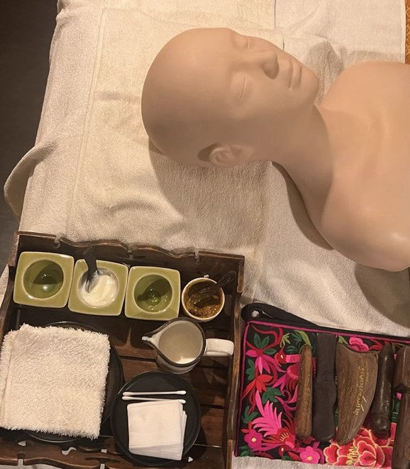 Le principe est similaire à celui du massage Tok Sen pour le corps, mais cette version adaptée au visage utilise des outils plus petits et des tapotements plus doux. Contrairement au Tok Sen corporel, qui vise à détendre les muscles, le Tok Sen du visage a pour objectif de les tonifier et de les raffermir. Avec le temps, les muscles du visage se relâchent, entraînant l'apparition de rides, de poches sous les yeux et de joues affaissées. Grâce à des vibrations délicates, cette technique stimule les muscles faciaux pour renforcer leur fermeté et leur tenue.